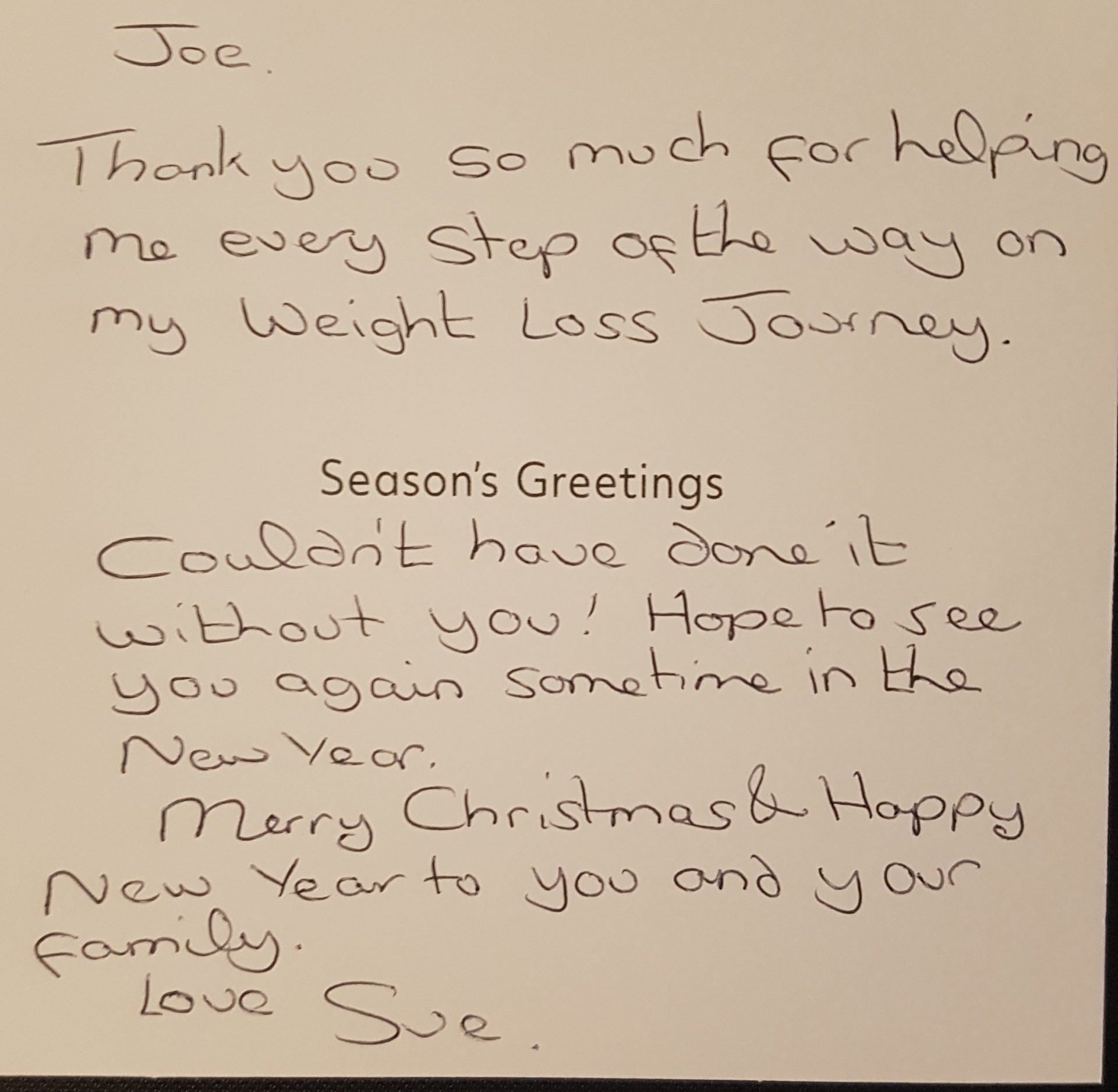 Not for a second was Joe's mood variable and he provided an extremely comfortable safe environment to weigh myself regularly, and not feel belittled at the result - I always left every single session encouraged.
